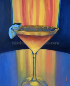 Blood Orange Martini is a 24”x20” oil on canvas. It depicts the titled beverage in bright, fiery colors.