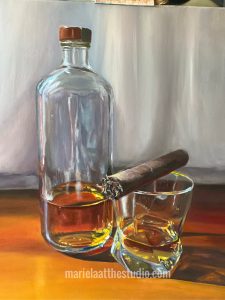 Scotch and Cigar is a 24”x20” oil on canvas. Date- 22