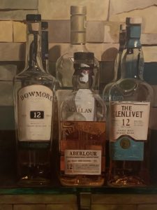 Spirits is a 36”x48” oil on canvas depicting several scotch whisky bottles.