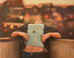 A 16”x20” oil on canvas. This painting captures a quiet moment with the city lights.
